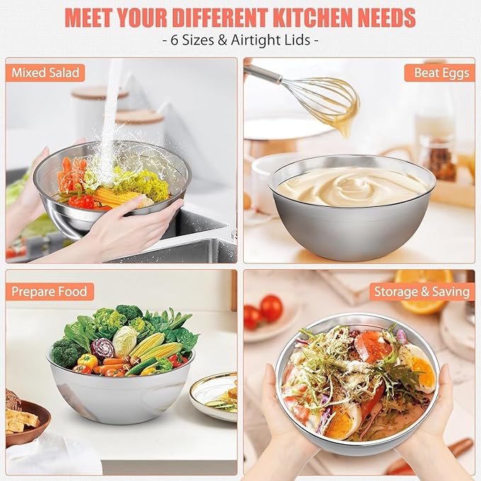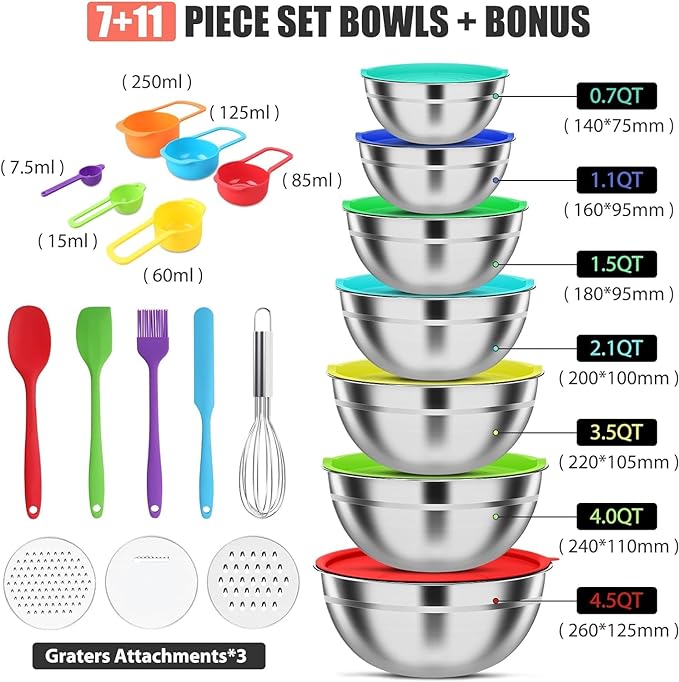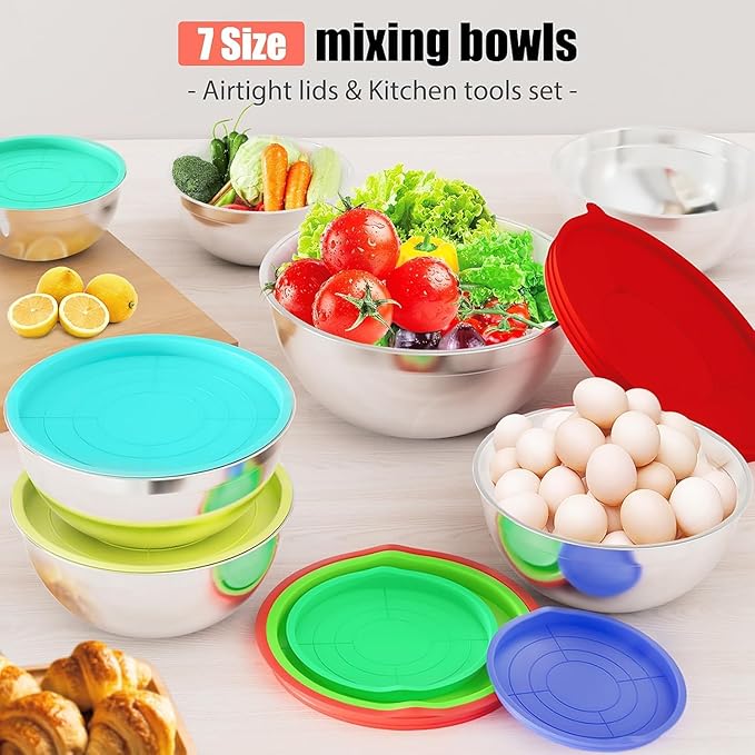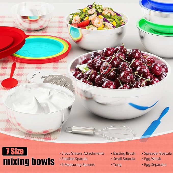 【SUPERIOR VALUE MIXING BOWLS SET】ENVTEK multipurpose combination set includes 7 mixing bowls of various sizes - (5.5, 4.5, 3.5, 2.1, 1.5, 1.1, 0.7QT). The lid of the 4 QT bowl has a removable center, where one of 3 free graters can be placed to grate your vegetables. This essential set will cover the basic needs of your kitchen without costing you a great deal of time and money to buy each piece individually. This set of bowls comes with a basting brush, spreader spatula, flexible spatula, egg whisk, and 6 measuring spoons. 【Premium 304 Stainless Steel Material】Each kitchen mixing bowl is made from high-quality 304 stainless steel, is well coated to prevent rust and designed to resist dents. Strong stainless steel improves the corrosion resistance and scratch resistance of these metal mixing bowls, so they will still look new after long-term use. 【Dishwasher Safe & Easy to Clean】Our set of metal mixing bowls with lids can be stored in the freezer, and are suitable for the dishwasher, saving your precious time perfectly. (Tip: Please remove the lid before washing in the dishwasher.) 【Nesting & Space-Saving Design】Nesting mixing bowls for the kitchen have a sequential stack and organizable design, nesting these containers vertically will save space. Ideal for meal prep, or making pancakes, our 7-piece nesting mixing bowls add convenience and versatility to your kitchen. They are the perfect gift for you, your friends and family. 【Durable & Reusable】The lids for these mixing bowls are made from food-grade plastic, BPA-free, with rust and corrosion resistance. This reusable set of kitchen bowls with lids are easy to store in kitchen cupboards, and quickly organized for both meat and vegetarian dishes, juices, soups and more. Customer ratings by feature