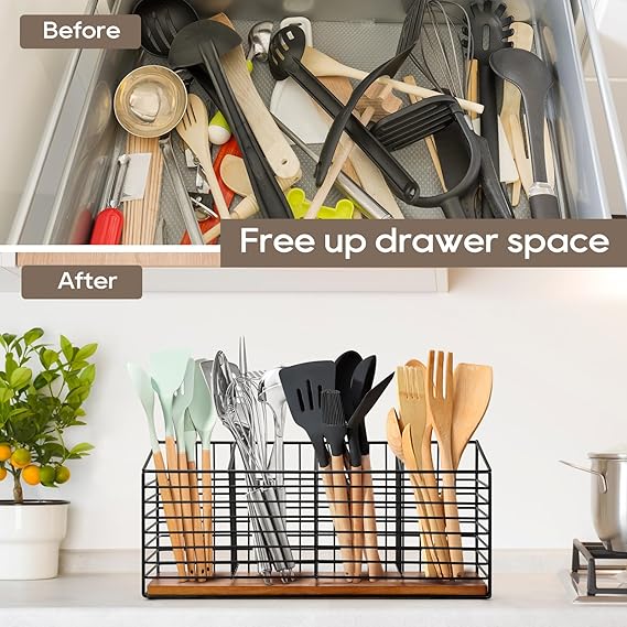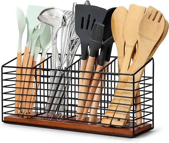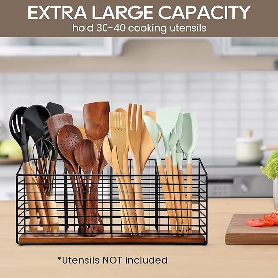 【Extra Large Storage】This 15.7"L x 4.3"W x 7.1"H extra large rectangle utensil holder for countertop provides convenient and stylish storage for your large or long cooking tools, holding 35 to 40 common utensils, ideal for kitchen with plenty of utensils, free up precious drawer space. 【4 Compartments Design】The cooking utensil container has 4 spacious compartments that allow you to classify your cooking tools as needed and quickly access them while cooking, suitable for spatulas, spoons, whisks, ladles, tongs, cutlery and more cooking tools. Keep your utensils organized and countertop neat. 【Non-Slip and Stable】This spatula holder for countertop is made of anti-rust metal material and premium oak base for durability. The 3.3 lbs. weight ensures that the utensil caddy is stable enough not to tip over when placing long utensils. Four non-slip pads on the base to protect the countertop from being scratched. 【Fully Open Design】The open design ensures good ventilation, no accumulated water, makes the utensils not easy to get moldy. Easy to wipe down and clean. 【Modern Farmhouse Look】Matte black metal wire, wooden base, beveled opening, this minimalist look kitchen tool holder can blend in perfectly with any style of kitchen decor, making this kitchen accessory a great addition to your kitchen counter. 【Great Gift Idea】This farmhouse utensil holder is suitable for everyone who loves cooking. Impress your family and friends with this unique cooking gift for Housewarming, Christmas, Mother's Day, Birthday.