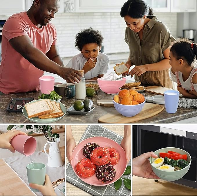 Wheat Straw: The dinnerware set includes plates, cups, bowls are made of natural wheat straw fiber and food grade PP material. Non-toxic, odorless and environmentally friendly, with smooth surface and drop/shock resistant. Stainless Steel: Our flatware set is made of high quality food grade stainless steel which is durable, corrosion-resistant and nickel-free. The polished design makes it very easy to clean, dishwasher safe and suitable for both casual or formal dining. Space Saving: Designed with space-saving style and smooth round edges. Compactly without taking up a lot of space in your kitchen cabinet and plate shelf, which avoids the risk of tipping over. Value Pack: You will get wheat straw tableware set (4 x plates, 4 x cups, 4 x bowls) and 4pcs stainless steel cutlery set include knife, fork and spoon, they are practical and stylish. With sufficient quantity which is enough for your daily use. Versatile Use: An ideal choice for daily use at BBQ, picnic, camping trip, dorm, school or office. Make your meals more colorful and appetizing with wheat straw dinnerware!