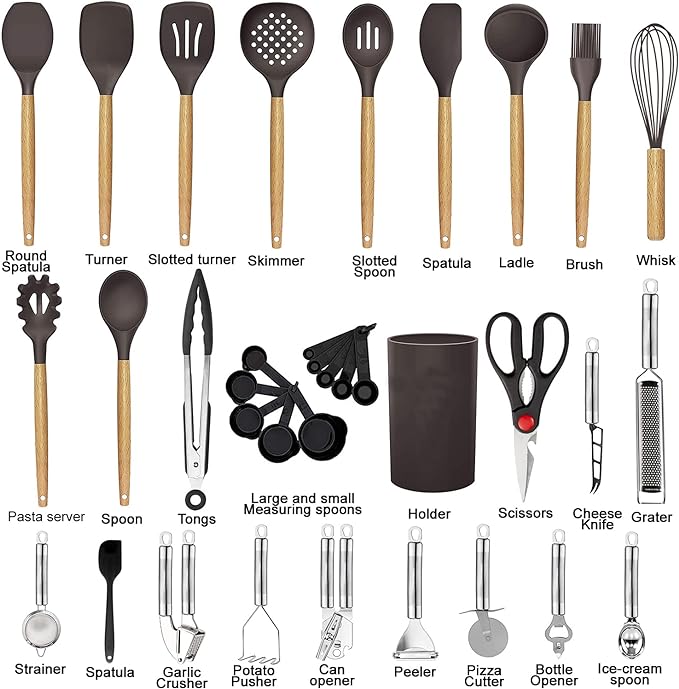 35 COOKING UTENSILS - Utensil Set includes everything you need to cook that perfect dish,includes Slotted Spatula ,Slotted Spoon,Flexible Spatula,Slotted Turner, Solid Turner, Pasta Server,Solid Spoon, Kitchen Tongs, Draining Spoon, Whisk ,Deep Soup Ladle,Spatulas,Brush,Peeler,Pizza Cutter,Bottle Opener,Potato,Pusher,Ice-cream spoon,Can opener,Grater,Scissors,measuring cups and spoons set,Hooks,Tea strainer,Garlic crusher,Cheese knife,Spatula,Holder THE WOODEN HANDLE IS ANTI-SCALDING.THE SILICONE SOFT AND DOES NOT HURT THE POT - This kitchen utensil handle is made of solid wood. Smooth and comfortable to the touch, it completely prevents the heat transfer during the cooking process. Avoid scalding the chef's hands. Deep Soup Ladle, Solid Serving Spoon, Slotted Spoon, Flexible Spatula, Round Spatula, Pasta Server, Slotted Turner, etc. are made from food grade silicone. No warping, soft, completely protect your pot from being scratched. PROTECT YOUR EXPENSIVE PANS: The non-scratch silicone heads pair great with your expensive non-stick pans, pots and bakeware, ensuring that the cookware surface is not scratched or dented; they’re the perfect tools to extend the life of all your kitchen pans. NO PLASTIC WHATSOEVER: There is no trace of plastic in the entire construction. It’s also usable for an effortless clean, with the elegant design sprucing up your kitchen. This kitchen utensils set is to be completely free of BPA and latex. MONEY BACK GUARANTEE - If these utensils don’t meet all of your cooking needs then please return it.