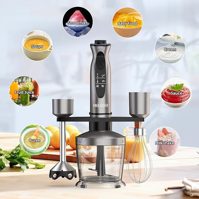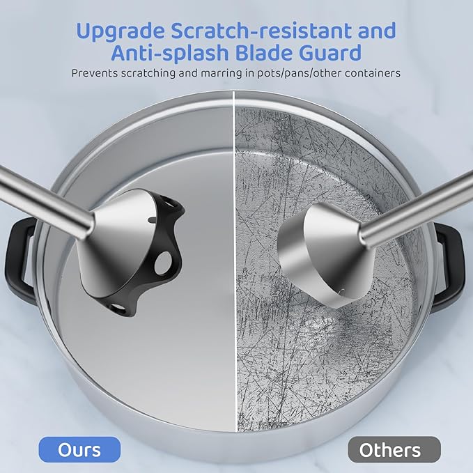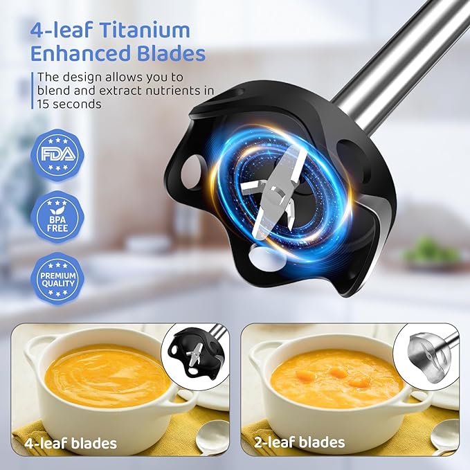 【Versatile Immersion Blender】Including Immersion Blender Handheld, 27 oz/800ml Beaker, 20 oz/600ml Chopper, Milk Frother, Egg Whisk, and Storage Bracket. Meet your need to make a variety of foods and also improve your cooking skills. The Ergonomic handle supports one-handed control with ease 【1000W Powerful and Fast Hand Held Blender】Equipped with an enhanced 1000W all-copper motor and 12-Speed adjustable settings, as well as Turbo Boost, it is perfect for making ingredients, soup, sauces, puree, baby food, smoothies, milkshakes, mayo, chutney, whipped cream, salsa, guacamole, cake batters, etc. 【Scratch-resistant Design and Unique Blending Blade Guard】The Anti-scratch and Anti-splash Semi-wrapped blade guard designed for protecting your containers and preventing splashing and keeping food from getting stuck 【Easy to Clean & Dishwasher Safe】Made of BPA-Free materials. The attachments are easy to clean, all parts are detachable, you are able to clean it very quickly with soap, warm water. Except for the main motor unit, all other parts are Dishwasher Safe, saving the trouble of cleaning 【Gift for Kitchen & Lifetime Worry-Free Assurance】The electric hand blender is a perfect gift for your family, friends, women and men. We offer 2 Years Warranty and Lifetime technical support. If you need any help, please feel free to contact us and we will give you a 100% satisfactory result