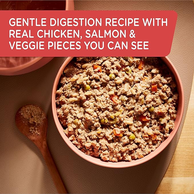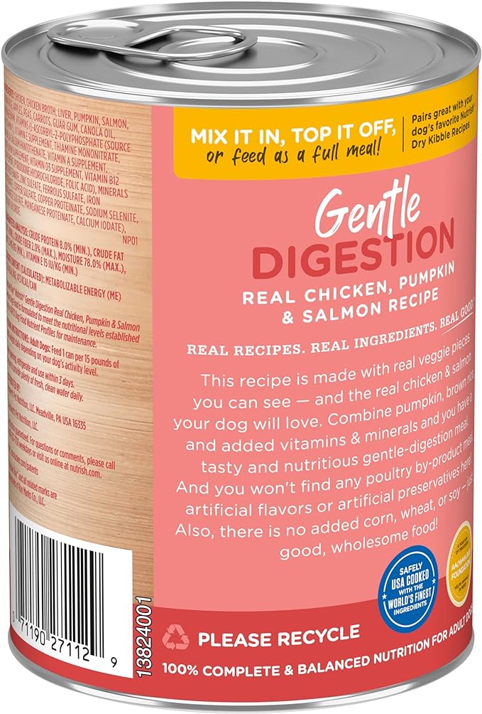 Contains twelve (12) 13-ounce cans of premium paté wet dog food Made with real veggie pieces you can see and real chicken and salmon your dog will love Natural food for adult dogs with added vitamins, minerals and nutrients For gentle digestion No poultry by-product meals or fillers