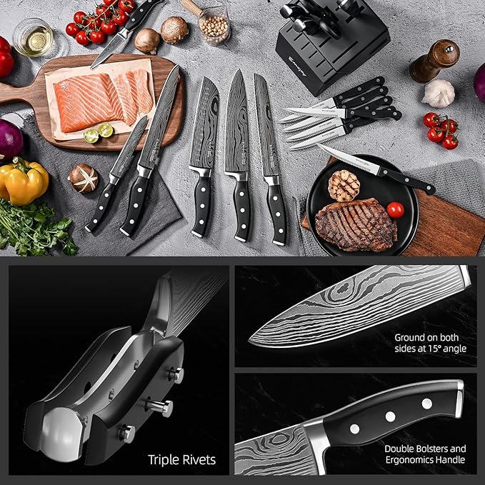 【18Pcs Knife Set】8" Chef Knife, 8" Slicing Knife, 8" Bread Knife, 7" Santoku, 5" Boning Knife, 5" Utility Knife, 5" Tomato Knife and 3.5" Paring Knife, 6pcs Serrated Steak Knives, 3pcs tools (Kitchen Shears, Built-in Sharpener and Carving Fork) and black hard wooden block. 【Balance and Ergonomics】The special geometry double bolster ensures balanced handling. Equipped with curved comfortable grip to guarantee effortless cutting. 【Ultra Sharp】Emojoy kitchen knives are ground on both sides at 15° angle, which makes our knives extremely sharp. 【Blade Spine】3mm widen spine is the typical feature of forged quality, is suitable for cracking shellfish or nuts. 【Stainless Steel】Made of high carbon stainless steel, easy to clean and maintain. Not only hand washable, but also machine washable.