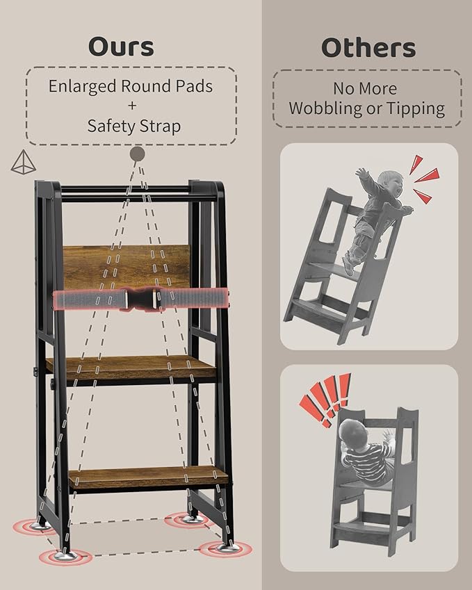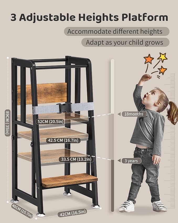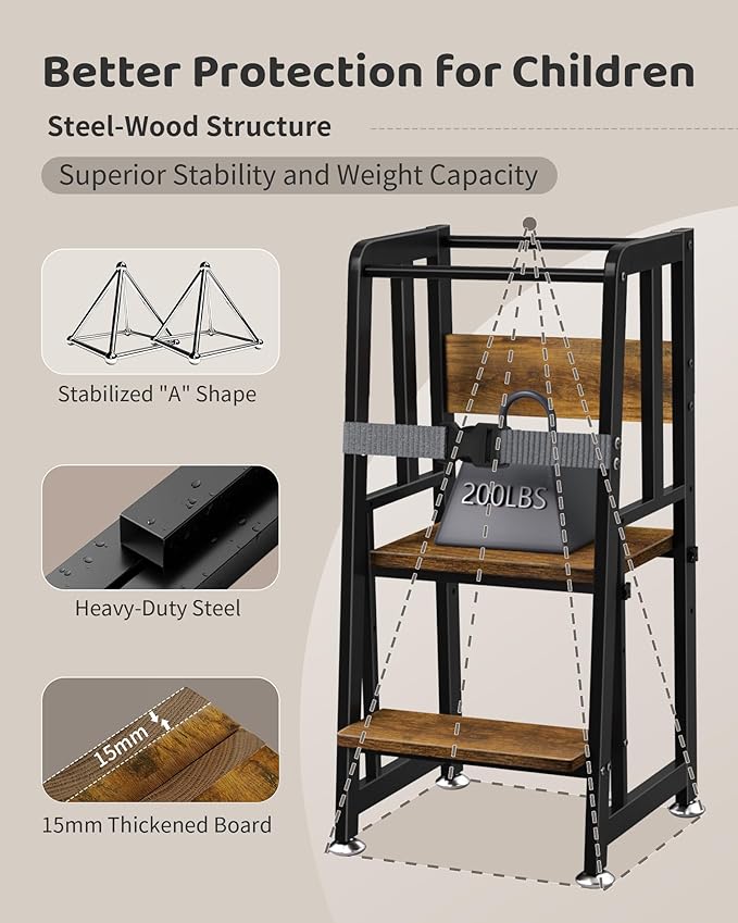 【Advanced Steel-Wood Structure】 Improve the defects of traditional pure wood structure toddler kitchen learning towers and say goodbye to wood cracks and screws becoming loose! Our learning tower features a heavy-duty steel frame and 15mm thickened particleboard(non-cracking), coated for water and rot-resistant. It supports up to 200 lbs, providing superior stability and protection for your kids! 【Foster Self-Reliance】 Free your hands when cooking, washing dishes or working, little one will campany with you and learns skill by observing. Whether you're teaching your child to assist with meal prep at the kitchen counter, encouraging independent dining, or handling tasks like handwashing and teeth brushing-this toddler helper stool has got it covered! 【3 Adjustable Heights】 Our learning tower for 1-3 toddlers offers 3 adjustable heights. Effortlessly adjust the platform height to accommodate different heights and adapt as your child grows. This kids kitchen step stool will be a constant companion throughout your child's journey from 18 months to 3 years old. 【Stability and Security】 Stable A-shaped structure, along with specially designed adjustable, enlarged round feet pads (floor-friendly), effectively prevents tipping and slipping. Enhance the stability of your toddler counter stool for worry-free use. Additionally, the robust strap can prevent children from falling (can be easily opened when the child needs to climb up). 【Easy Assembly】 Our package includes everything you need for effortless setup: clear instructions, numbered screws, and all essential tools. You can easily have the toddler step stool assembled in just 20 minutes. Important note! When assembling, please choose the appropriate screw as indicated by the screw numbers in the manual.