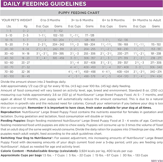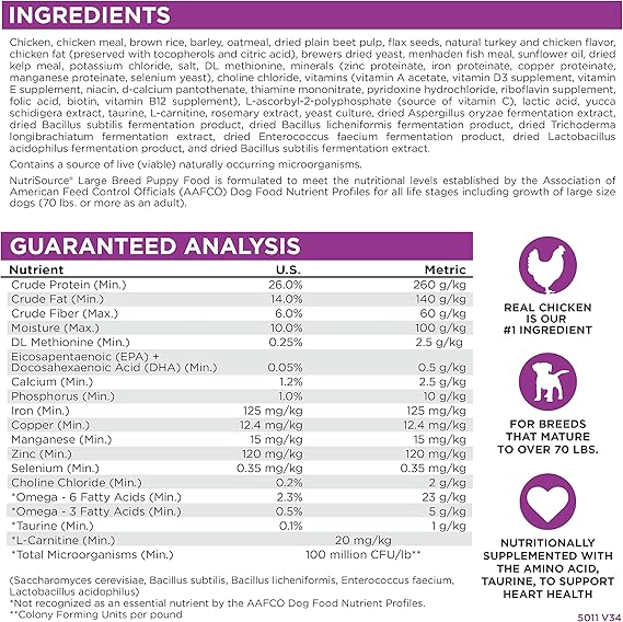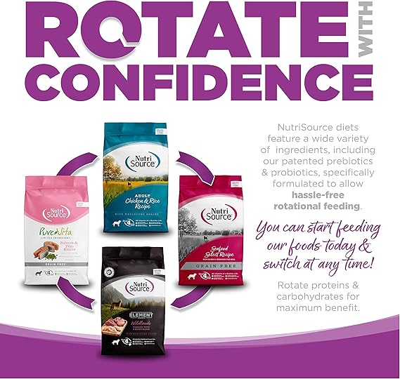 CONTAINS: (1) 26LB Bag of NutriSource Chicken and Rice Dry Dog Food for Large Breeds As a member of our grain inclusive series, NutriSource Chicken and Rice Dry Dog Food is formulated to meet AAFCO guidelines for all lifestages NutriSource grain inclusive formulas deliver compact nutrition and include prebiotics and probiotics to help support a healthy gut Balanced Omega-3 and Omega-6 fatty acids along with L-Carnitine, taurine, choline chloride and DL Methionine supplementation to promote heart health make NutriSource grain inclusive formulas stand out Go Full Circle: Give your dog the variety they crave, maintain a healthy gut with rotational feeding, and optimize nutrition by introducing diverse proteins—all with simple steps, tasty options, improved digestion, less scratching, more energy, and a fun and fresh approach to keep your pup happy.