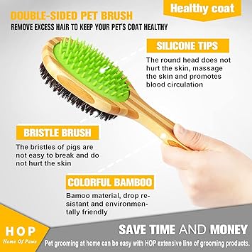 Two sided pet brush two in one dog hair brush. One side of the silicone head is used for hair removal and massage. The side of the brush can remove loose hair and debris on the surface. It is suitable for cats or dogs of all types and sizes. The affordable pet comb can help you save the cost of your pet and reduce the time you spend cleaning your pet. The silicone needle of the silicone needle comb is soft, comfortable and not easy to break, and will not harm the pet's skin. It can also play a massage role and promote the pet's blood circulation The dog brush with log color design is solid, healthy and convenient. The handle of the pet brush conforms to the ergonomic design, and it is comfortable to hold, and it will not be laborious to use for a long time. Soft bristles are of moderate hardness, much softer than nylon materials! This bristled dog brush is a good choice for sensitive skin areas such as the abdomen, face, and all short haired breeds. Some dogs can use it to brush their teeth. The perfect packaging design can be used as a gift between friends who like keeping pets. Great gift This pet brush is definitely a good gift for pet beginners and enthusiasts.
