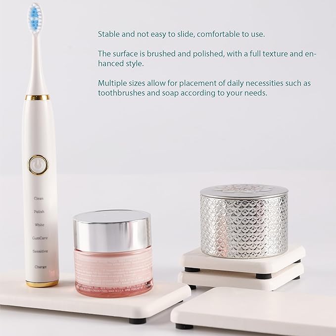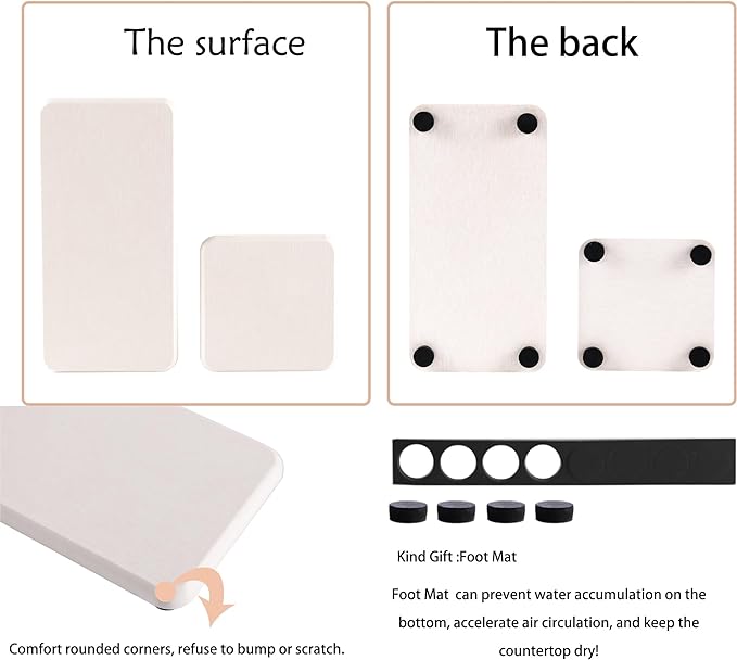 Made from natural Diatom mud and plant fiber, small holes within diatomite enable it have amazing water absorption. They could absorb water and gets dry in a few minutes. It makes the Bathroom Counter top more dry and tidy. Silicone footpads boost the slip-resistance of coasters while keeping them out of the bathroom vanity. This design improves the contact surface between the diatomaceous earth coaster and the air, accelerate moisture evaporation, and prolongs the service life of the product. Suitable to be used as absorbent mats for soaps / cups / soap bottle / dish sponge / make-up bottles, and anywhere you need to absorb water quickly and keep the table / countertop surface dry.Perfect Design Created for the Modern Home, to make life clean, comfortable and orderly. Each package included: Product A*2; Product B*2;Silicone non-slip mat*16; Product A Size: 3.15 inch * 3.15 inch * 0.35 inch (8cm * 8 cm * 0.9 cm) Product B Size: 6.3 inch * 3.15 inch * 0.35 inch (16cm * 8 cm * 0.9 cm) Excellent service: Please feel free to contact us for any problem about the products. This product should be cleaned and air-dried regularly, If not cleaned, the use effect of the product will be affected!Dust can be washed directly with clean water or wiped with wet cloth and dried, clean stubborn stain with detergent, or the stains can be removed by gently grinding the surface with sandpaper.