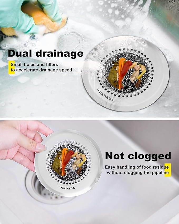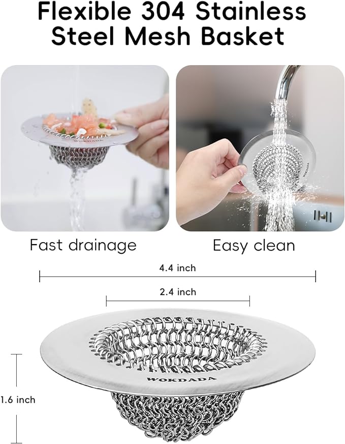 Inverts for Easy Clean: Easily empty our stainless steel sink strainer with its patented design that allows it to invert with ease. Besides, the chain mesh design is easy to clean Water Keeps Flowing: No matter how much trash the chain mesh sink drain strainer collects, the porous design allows water to drain quickly and prevents dirty water from rising Sturdy Material:The kitchen sink strainers is ensuring high rust resistance. It is made of 304 stainless steel. Even after using it for a long time it still looks like new Universal Size: With 4.4 outer diameter, this sink mesh strainer fits most sink drains perfectly. 3mm perfect aperture,Catch garbage and drain standing water efficiently Unique Shape: Revolutionize your sink with our unique stainless steel chain mesh sink strainer! Its exterior design sets it apart from other strainers and adds a touch of style to your sink