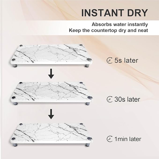 INSTANT DRYING: Diatomaceous earth sink caddy can hold up to twice its weight of water and fully absorb it within a few seconds. Keep the bathroom and kitchen countertops dry and waterless. HIGH QUALITY: Stone sink caddy is made of environmentally friendly and durable diatomaceous earth. The feet of the sink caddy are made of stainless steel and equipped with a non slip rubber bottom, which can withstand the worst wet conditions and reduce hard water stains on the countertop. MODERN DESIGN AND PRACTICAL: The design of the marble sink caddy is simple and beautiful and perfectly integrated into the bathroom or kitchen. The raised base design can promote rapid drying, reduce the accumulation of stain, and keep the counter dry. MULTI FUNCTION: Instant drying stone is used as soap and brush in kitchen, lotion in bathroom, toiletries and toothbrush cup. This sink tray provides a clean and orderly space for your kitchen, bathroom, or room, making it your best home essentials for new home! EASY TO ASSEMBLE: The sink tray size is approximately 11 x 4.7 x 0.98 inches, and our sink tray can hold up to 30 pounds per layer. Your sink tray can be easily assembled without any tools.
