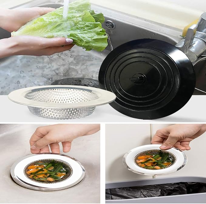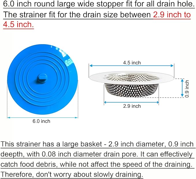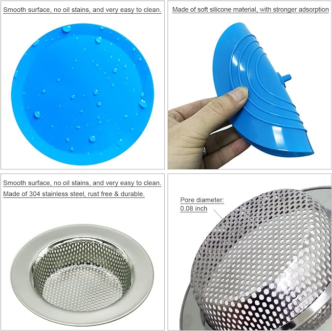[SIZE] Sink drain Stopper: 6 inch diameter large round wide edage, can cover all drain hole. Sink drain strainer: 4.5 x 2.9 x 0.9 inch, 0.08 inch drain pore, with large basket for collected food particles and debris. [PREMIUM MATETIAL] Sink drain cover: Made of food-grade silicone, non-toxic, soft and deformable with super adsorption, effectively prevent leaking water. Kitchen sink strainers: Made of 304 stainless steel, rust-free, and Overall thickening, which is more sturdy and not deformed. [EASY TO CLEAN] Both Seatery stopper and strainer are with mirror surface, no oil stains, can be easily cleaned by just washing with water. [PERFECT COMBINATION] Our kitchen sink stopper strainer set perfectly solves the problems of Sink water stored and food particles and debris catched, effectively preventing sewer blockage. They are a pair of MUST HAVE kitchen accesseries. [SAVE MONEY and ENVIRONMENT] A single plumber visit can cost hundreds. Drain snakes and liquid drain cleaners are a hassle to use and aren't always effective—not to mention the toll they take on the environment and on your pipes.