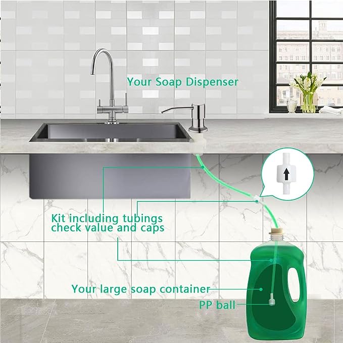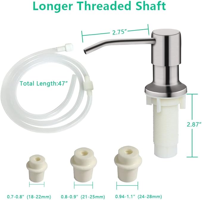 Built to last - Our Soap Dispenser for Kitchen Sink is made with exterior commercial grade premium stainless steel and interior durable PE plastic. The shiny multi-layered Brushed Nickel finish makes it resistant to corrosion and rust. Good for your soap dispenser pump replacement and for commercial soap dispenser. Longer thread/spout and tube - The kitchen sink soap dispenser with Lengthen and thicken 2.67 inches threaded fits most countertops (Granite, Stainless Steel, Wood), durable and not easy to break. With rubber washers on both sides, u don't have to worry about countertop water leaking through. No more messy refills - No more crawling under the sink. Our elegant sink soap dispenser comes with a 47”tube that goes directly into a large dish soap bottle, you can skip the frequent refill process. Multi-purpose use - Our Kitchen Sink Soap Dispenser can be used in a variety of ways fill it up and use it as a hand soap dispenser, liquid soap dispenser or even for lotion. Makes it one the must have kitchen sink accessories a real space saver. Warranty - 30 days money back, 12 months quality warranty. Any reason that makes you dissatisfied with this soap dispenser, let us know and we will make it right. Full Refund or a Free Replacement, whichever you prefer is okay. Add this great sink soap dispenser, saying goodbye to frequent refills.